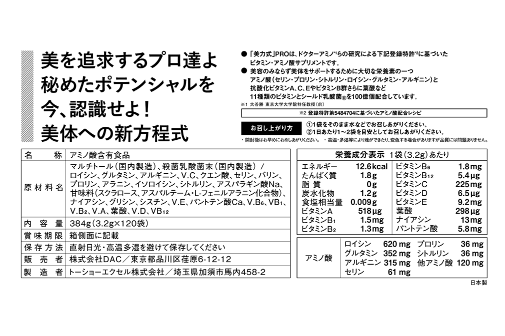• “BEAUTY POWER” PRO is a vitamin / amino acid supplement based on the following registered patent * 2 researched by Dr. Amino * 1 and others.