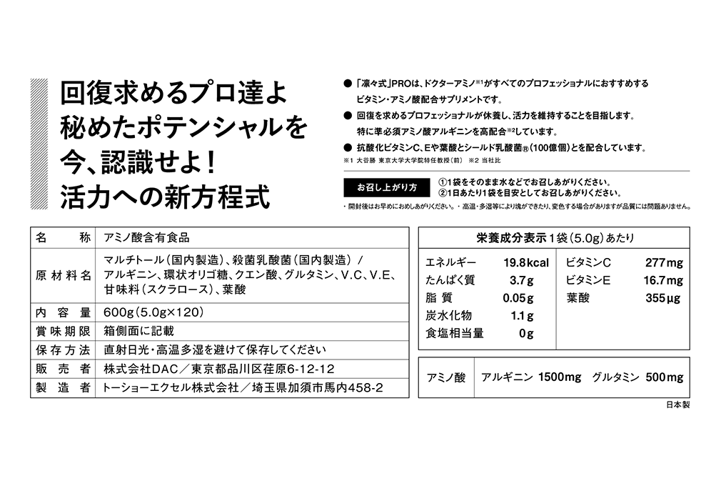 • Aimed for professionals requiring getting better to rest and maintain their vitality. In particular, it contains a high amount of the semi-essential amino acid arginine * 2.
