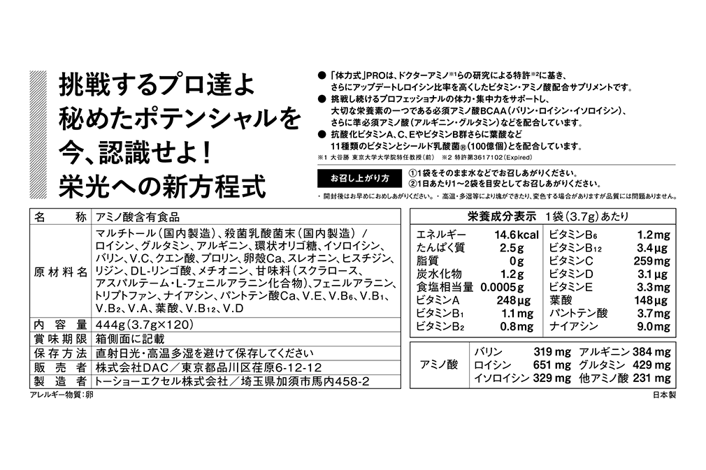 • "PHYSICAL POWER" PRO is a vitamin / amino acid supplement based on the patent * 2 researched by Dr. Amino * 1 and others, and has been further updated to increase the leucine ratio.