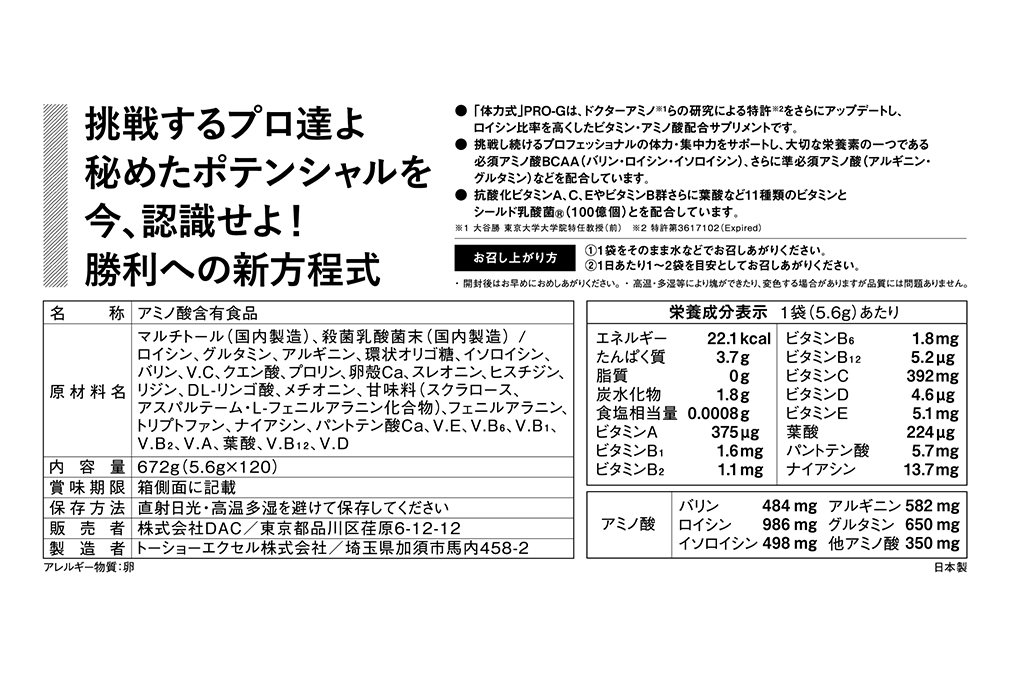 • Contains 11 types of vitamins, including essential amino acids (valine, leucine, isoleucine) and semi-essential amino acids (arginine, glutamine), which are one of the important nutrients for leading an active life.